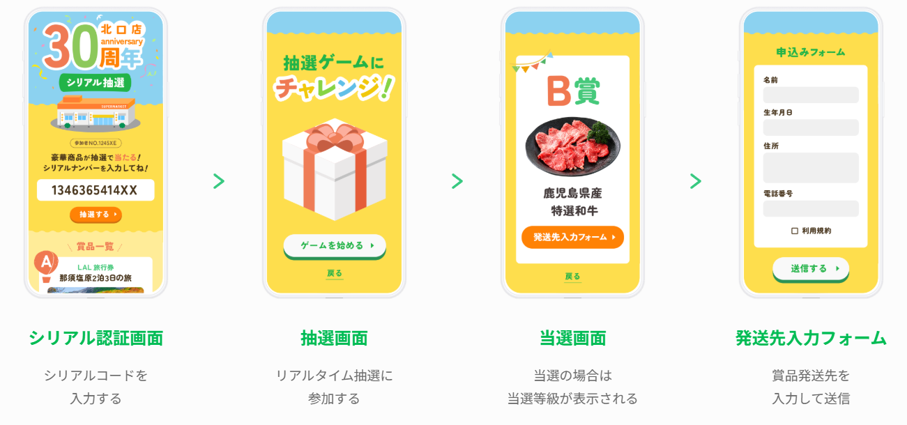 「あたり」が出た場合は画面上に住所入力フォームを表示し、後日賞品を発送する“デジタル完結型”の運用も可能です。 また、購入者にのみシリアルコードを配布するなどして、「購入者限定」や、「条件を満たした人だけが参加できる」キャンペーンにも対応できます。 |
