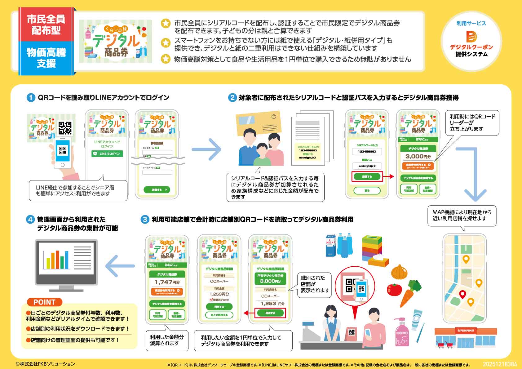 市民全員を対象に、物価高騰による家計負担を軽減するためのデジタル商品券です。1円単位で利用でき無駄がなく、LINE認証を採用しているため、スマートフォンに不慣れなシニア層でも簡単に使える仕組みです。