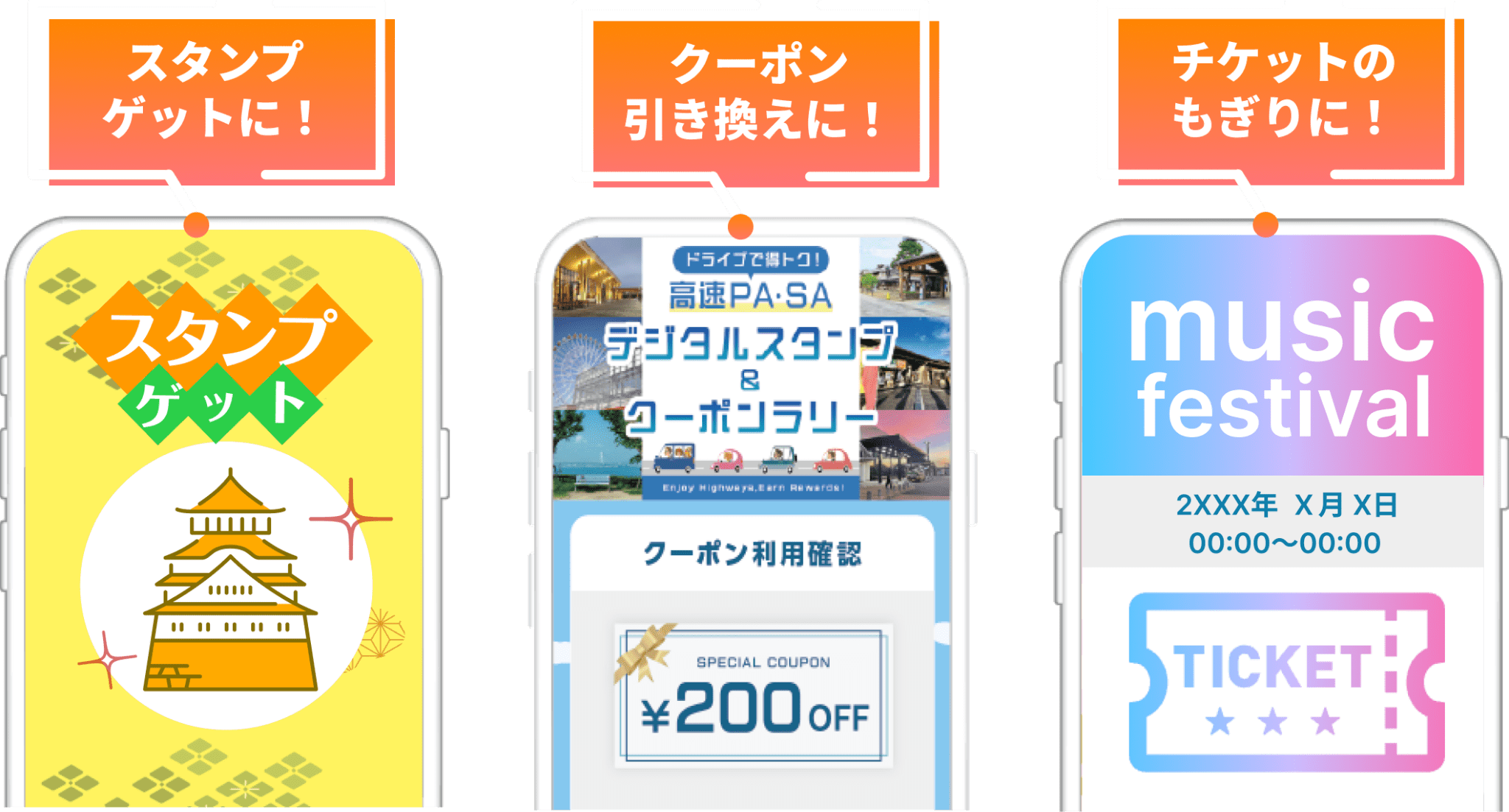 電子スタンプはスマホスタンプラリーやスタンプカードのスタンプ取得として使用出来るだけでなく、イベントやコンサート、スポーツ観戦などの入場スタンプとして利用したり、参加者又は購入者限定デジタルコンテンツプレゼントとして利用したり、クーポンや景品を引き換える際に「利用済」あるいは「引換済」とする消込スタンプとして利用することが出来ます。