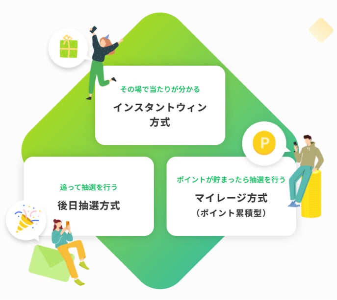Lotlly(ロトリー)では、シリアルコードを入力するとその場で当選結果が表示されるインスタントウィン方式と、後日抽選して当選者に景品を送付する方式、ポイントを貯めるマイレージ方式があります。