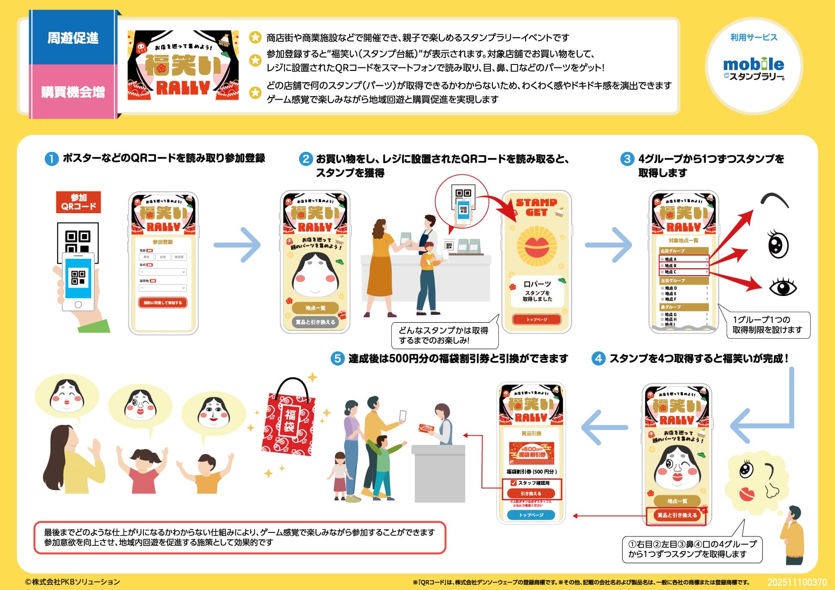商店街・商業施設などで開催でき、ゲーム感覚で“福笑い”を楽しめるデジタルスタンプラリーです。対象店舗を巡って、パーツ(スタンプ)を集めて福笑い(スタンプ台紙)を完成させます。どの店舗で、どのパーツが取得できるかはわからない仕組みのため、わくわくドキドキ感を演出できます。