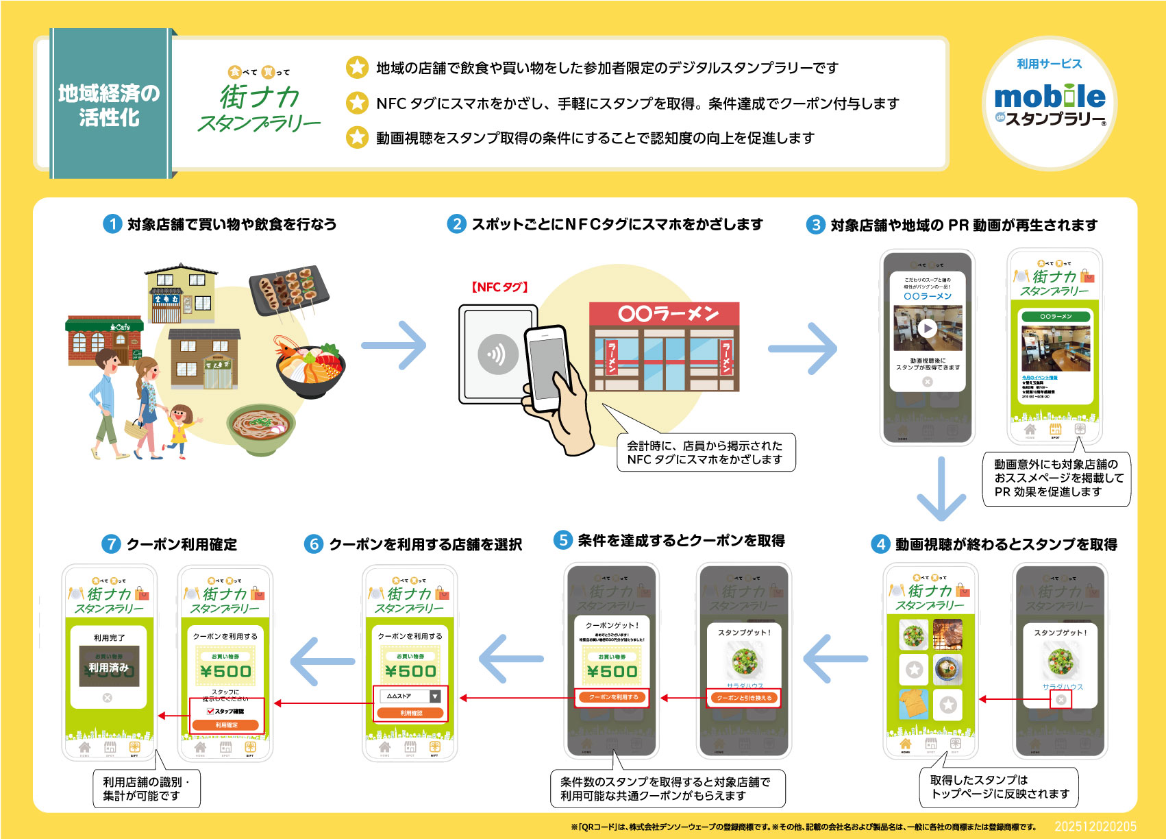 各地点に掲載されたNFCタグが仕込まれたポスターに対応機種のスマートフォンをかざし、スタンプを獲得します。各地点を周りスタンプを集め、すべてのスタンプを集めると後日景品が届く抽選に応募ができるようになります。さらにお得なクーポンを提供することで、売上アップや来客増に繋がります。