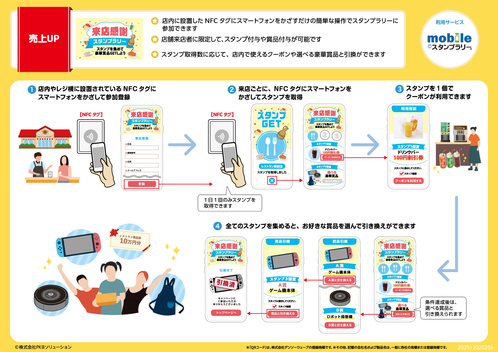 各地点に掲示されたNFCタグが仕込まれたポスターにNFC対応機種のスマートフォンをかざします。初回アクセス時は参加登録後、地点スタンプを獲得でき、達成条件をクリアすると景品が当たる抽選に応募することができます。