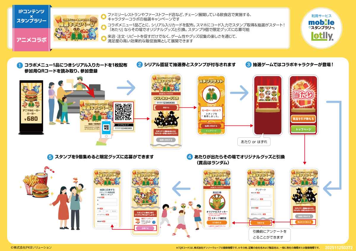 ファミリーレストランやファーストフード店などで行われる、キャラクターコラボキャンペーンです。コラボメニューを注文するともらえるカードに記載のシリアルコードを入力すると、スタンプを取得でき、さらに抽選ゲームに参加できます。抽選に当たるとオリジナルグッズがランダムでもらえるほか、スタンプを9個集めると限定グッズに抽選応募が可能になります。